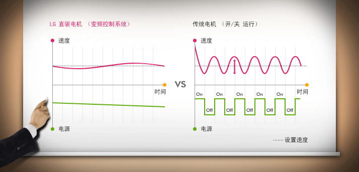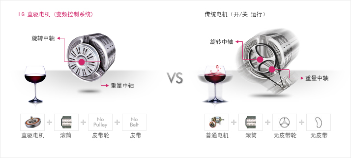 LG變頻直驅電機的好處 統一旋轉和重量中心:電機直接作用于滾桶中心 - 增加穩定性,震動最小化 - 減少噪音-無皮帶摩擦噪音 減少機器零件數量-皮帶和皮帶輪被去除 - 增加耐用性-不磨損