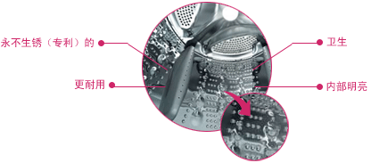 永不生銹(專利)的不銹鋼洗衣滾筒 采用專利的不銹鋼材質的滾筒,能保證衣物不受銹漬污染。傳統的油漆涂層桶長時間使用后漆層容易脫落,與此不同,LG的耐磨不銹鋼內桶非常經久耐用。