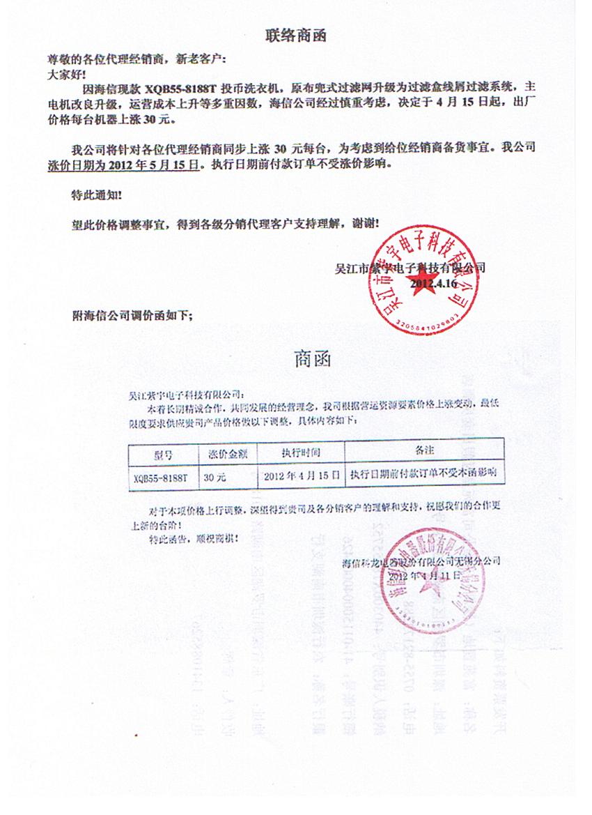 因海信現款XQB55-8188T投幣洗衣機,原布兜式過濾網升級為過濾盒線屑過濾系統,主電機改良升級,運營成本上升等多重因數,海信公司經過慎重考慮,決定于4月15日起,出廠價格每臺機器上漲30元。
